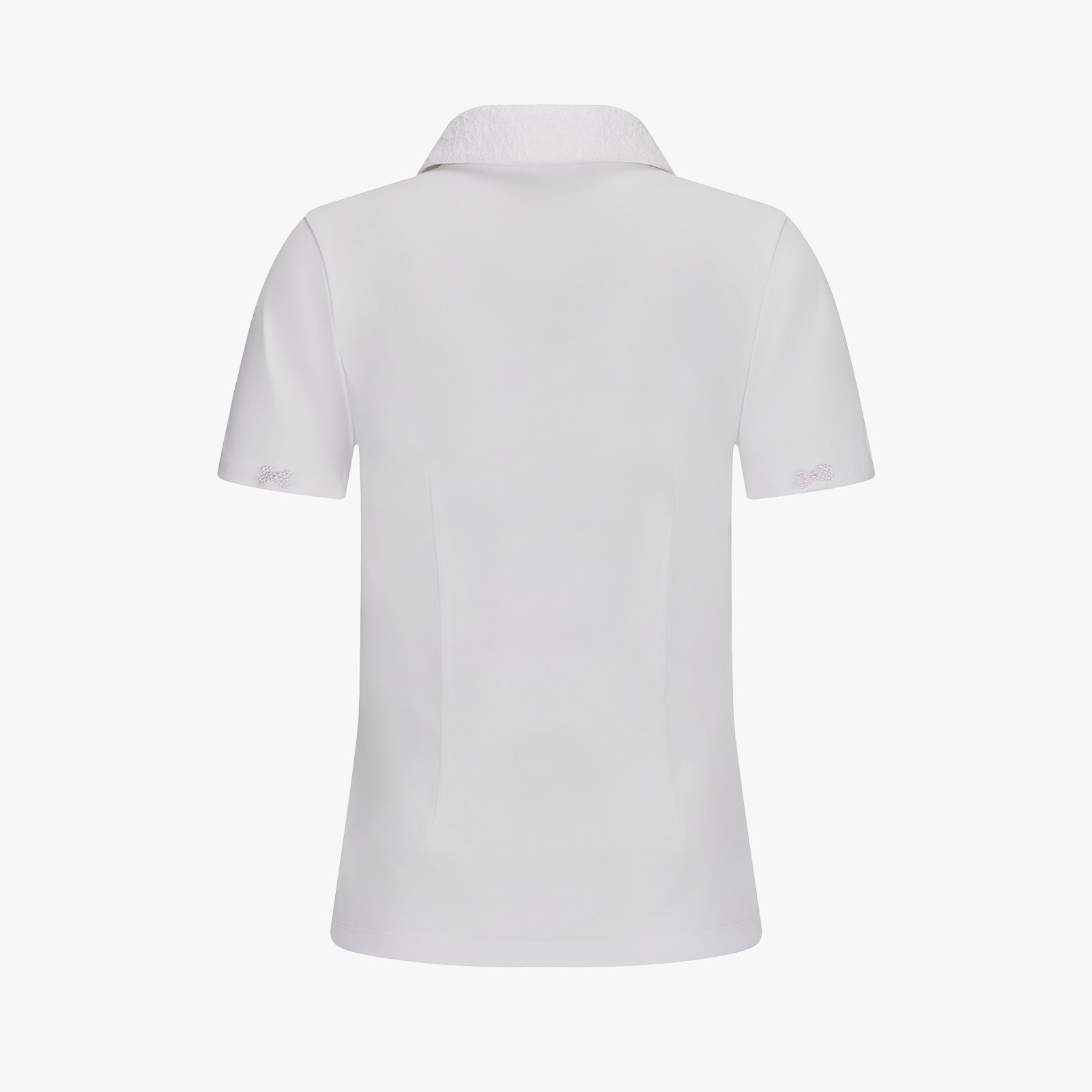 2. The lace-detail collar adds a feminine and delicate touch, while the pearl ribbon decoration on the back of the puff sleeves adds an elegant accent.