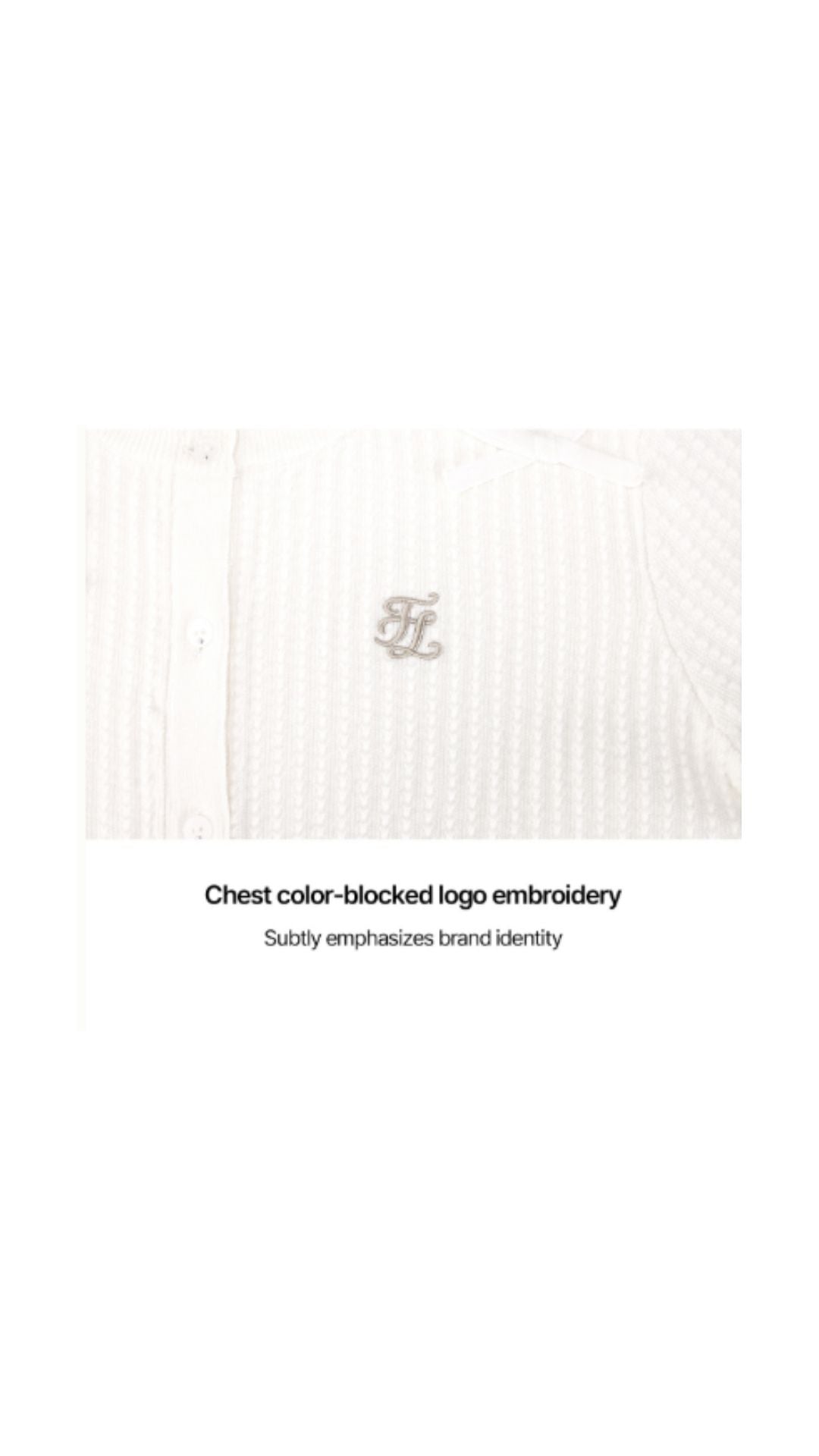 2. The front of the cardigan is adorned with small ribbon details, adding a feminine and charming vibe. The design features a classic silhouette with unique details for a stylish touch. Perfect for layering during the transitional season, this versatile piece can be styled effortlessly from everyday looks to casual outings.