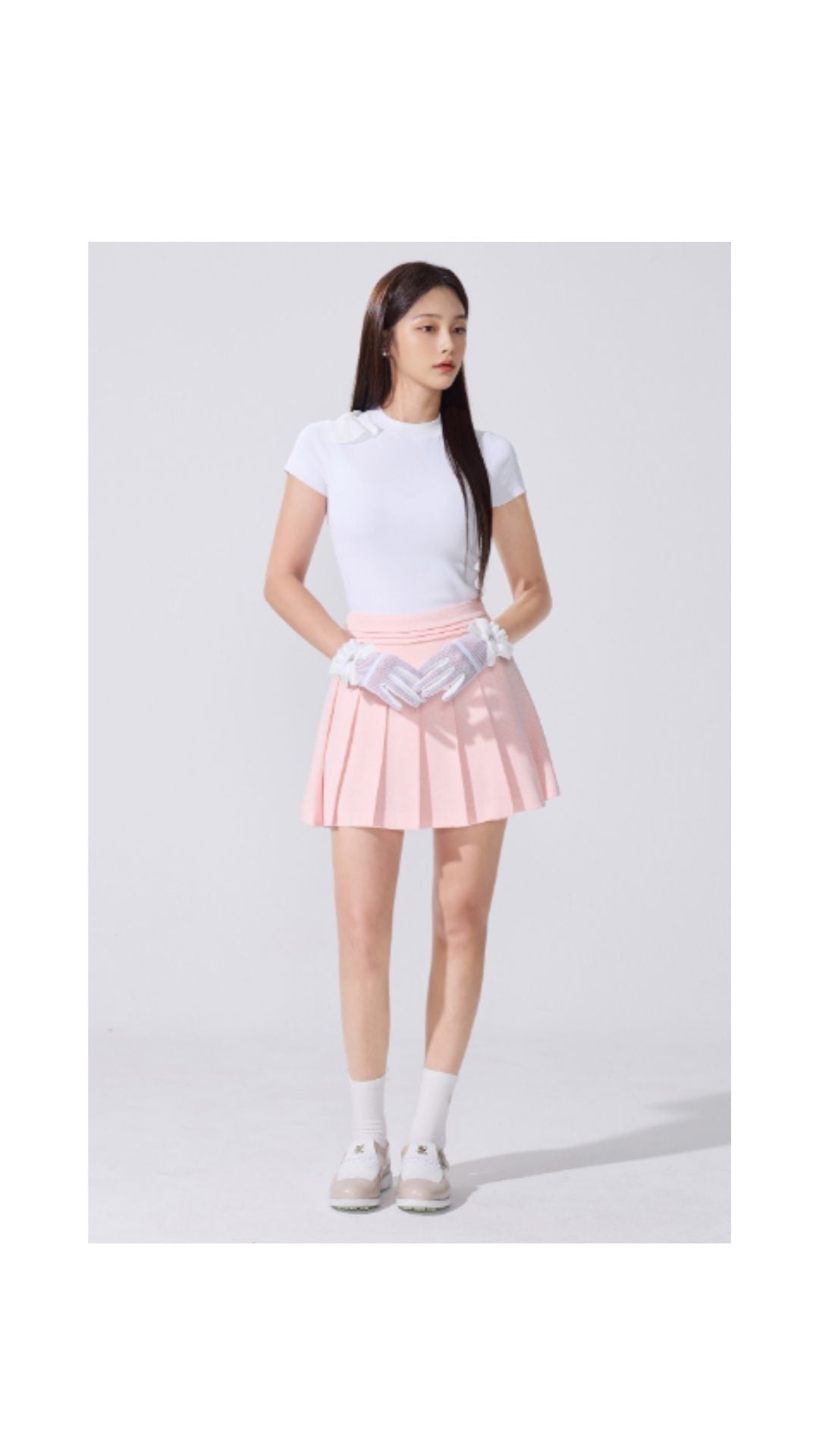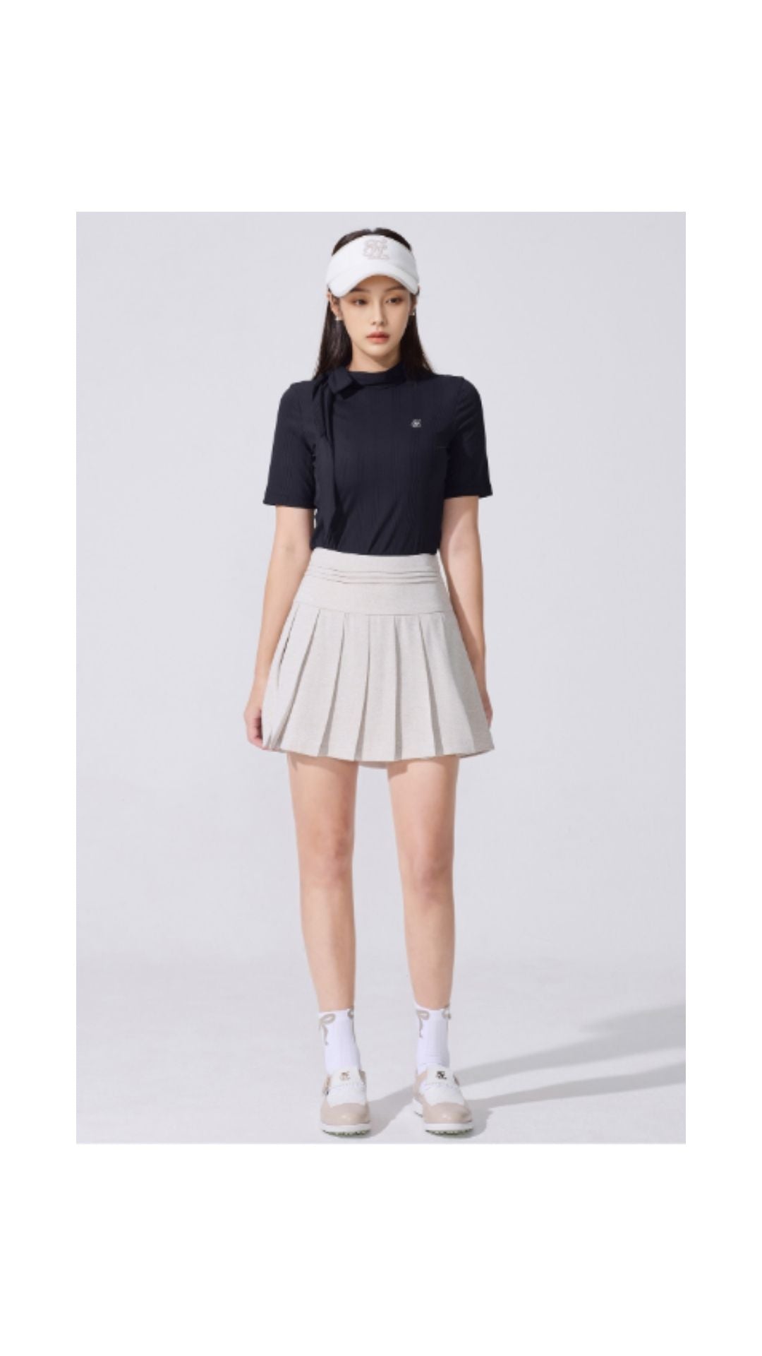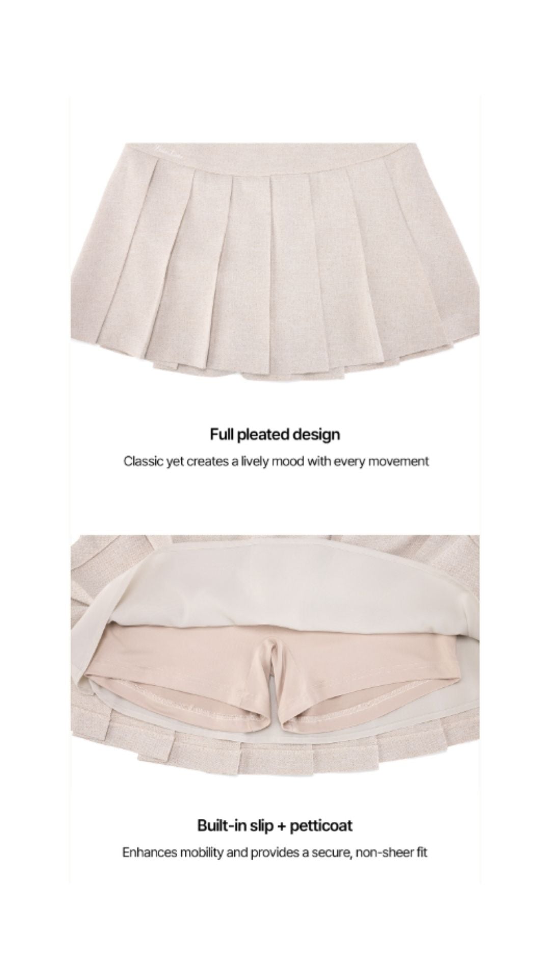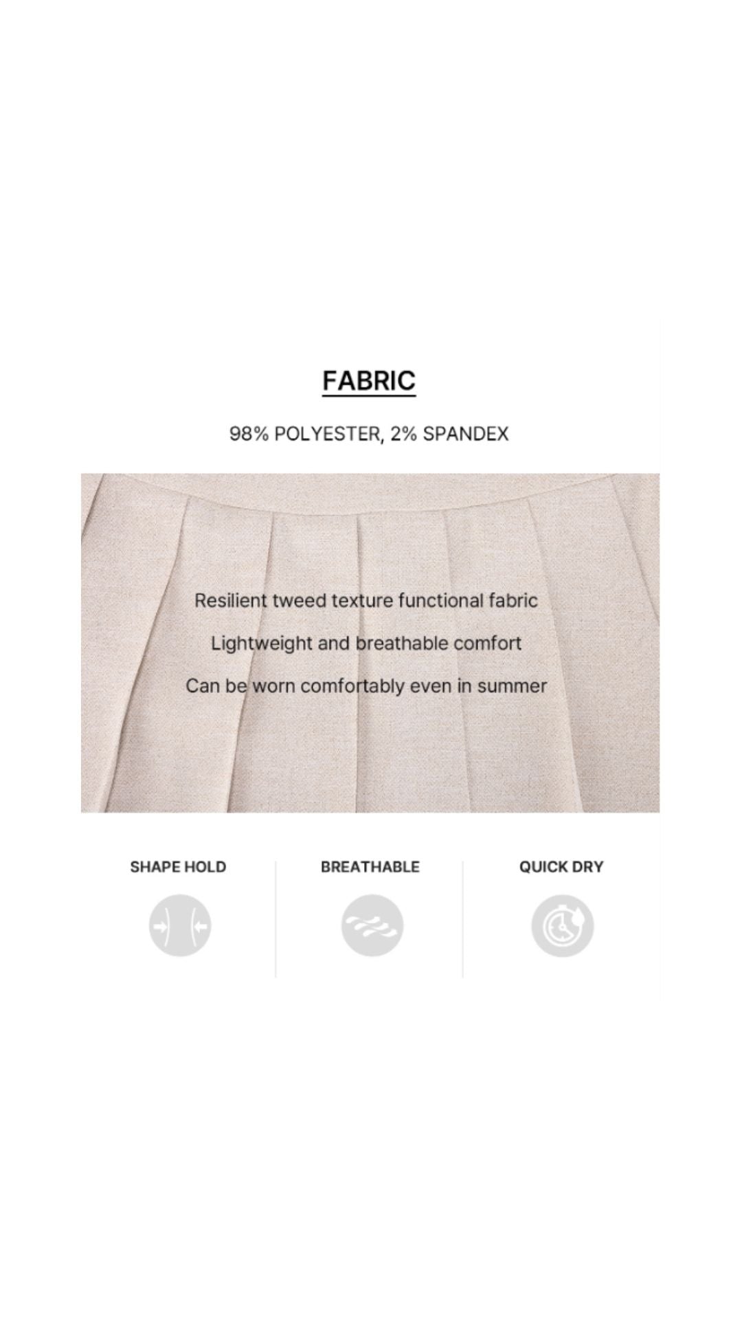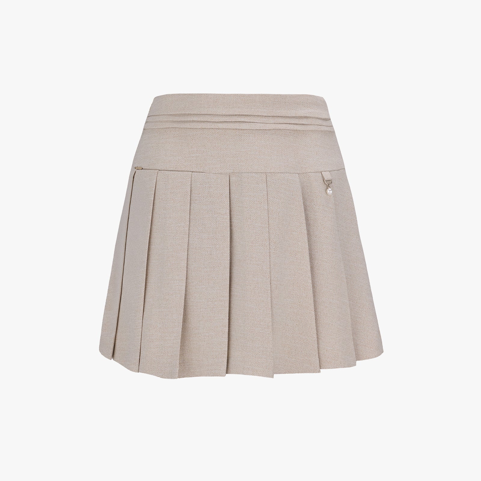 1. High-waisted pleats 2. Made from a luxurious tweed-textured fabric that resists wrinkles 2. Adds horizontal slit lines at the waist slit for a three-dimensional look 3. The overall pleated design creates a classic yet lively atmosphere 4. Versatile styling suitable for golf, formal, and casual occasions Inner lining for stable mobility